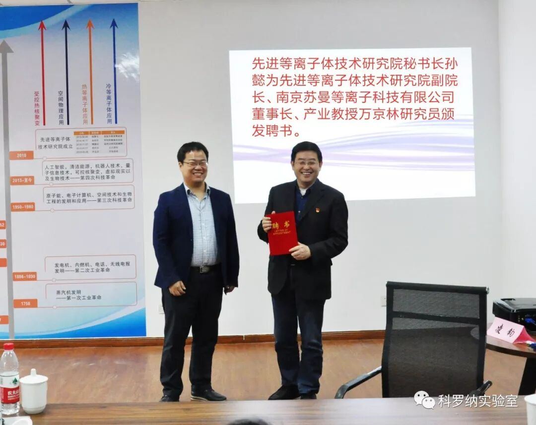 2019.5.6日,江苏先进等离子体研究院与南京苏曼等离子科技有限公司(科罗拉实验室)协同创办的先进等离子体技术研究院正式落户无锡广电新材料科技园,南京苏曼董事长万京林研究员任先进等离子体技术研究院副院。