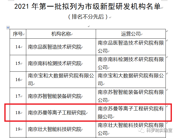 根据《南京市关于推动新型研发机构高质量发展的管理服务办法》文件精神,经机构申报、所在区(园区)推荐、受理情况公示、材料审核、现场考察等程序,近日,南京市科技局公布了2021年度第一批市级新型研发机构备案名单,苏曼等离子工程研究院有限公司成功通过了备案。